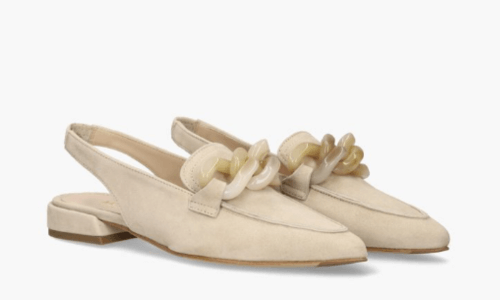 • Een open hiel kan in een werkomgeving prima, zeker als de rest van de schoen gekleed is zoals deze slingback loafers van Maripe (van Arendonk).