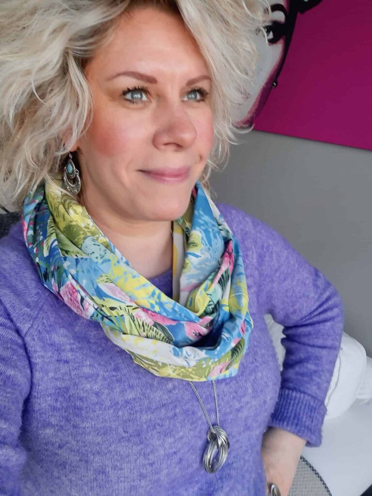 - Draag kleur bij je gezicht, al is het maar een pop of colour in een sjaal, oorbellen of een subtiele print. De camera houdt van kleur en het maakt jezelf én anderen blij. Vermijd strepen, nopjes en drukke prints.